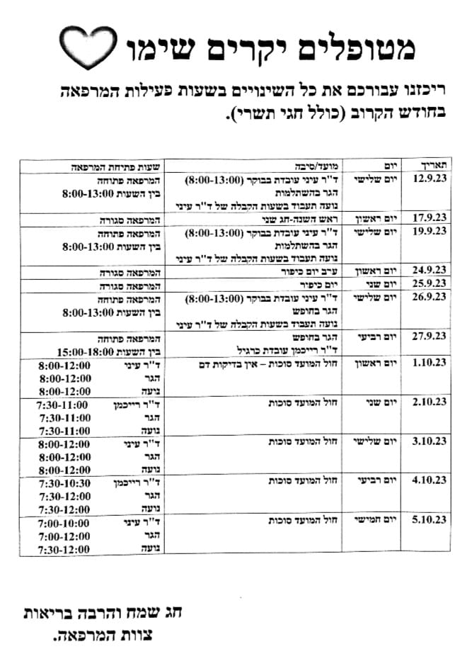 שינויים בשעות פעילות המרפאה בשבועות הקרובים.