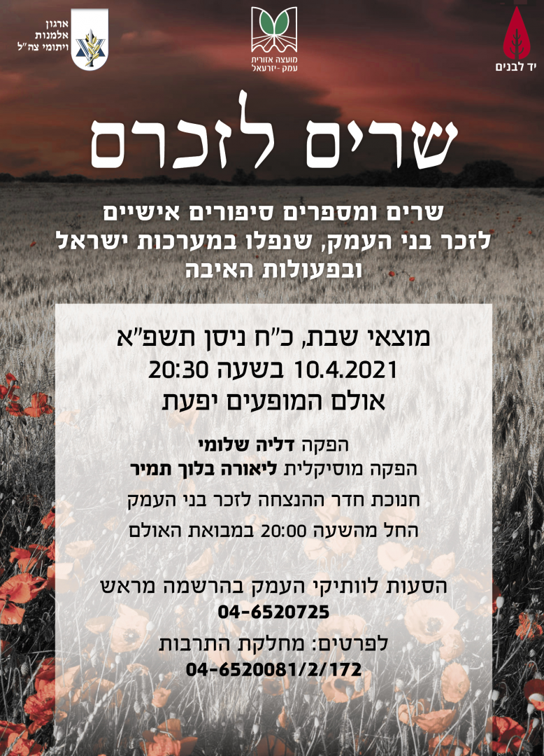 ארוע הזכרון שלנו כולל שירים המבוצעים על ידי סולני העמק וכן ארבעה דוברים, השנה ידברו על יקיריהם:
