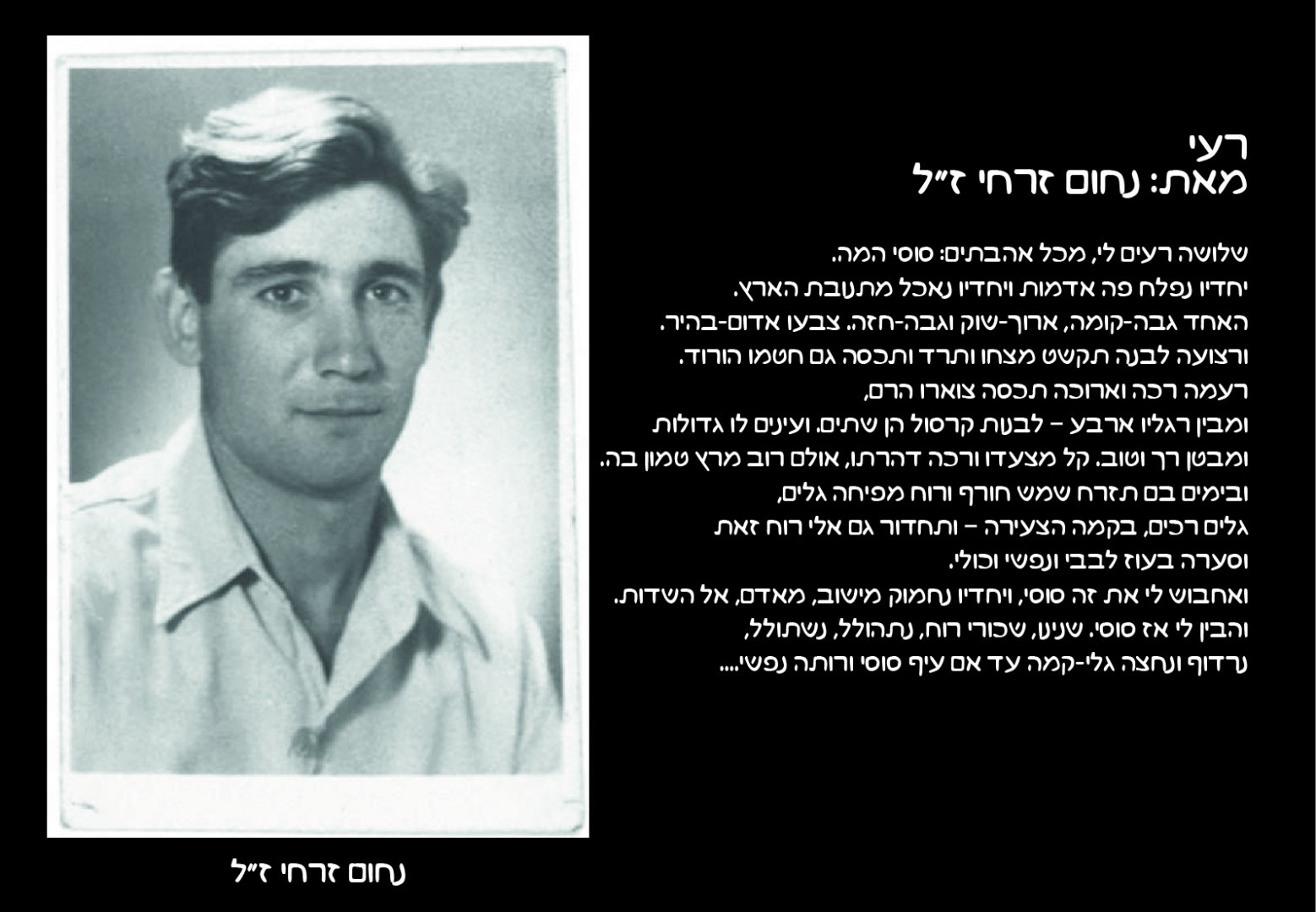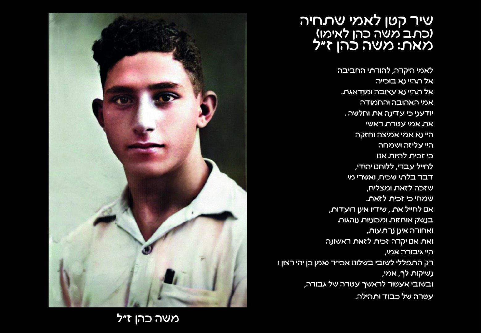הגיע לידינו שיר כתוב בכתב ידו של משה כהן ז"ל. שיר אהבה לאימו שנכתב לפני צאתו אל הקרב האחרון.